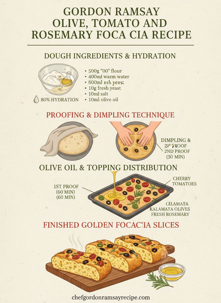 This Gordon Ramsay focaccia recipe delivers a light, airy crumb with a crisp olive-oil crust, topped generously with olives, cherry tomatoes, and fresh rosemary. The dough is gently proofed, dimpled by hand, and baked hot to achieve classic Italian focaccia texture and flavor.