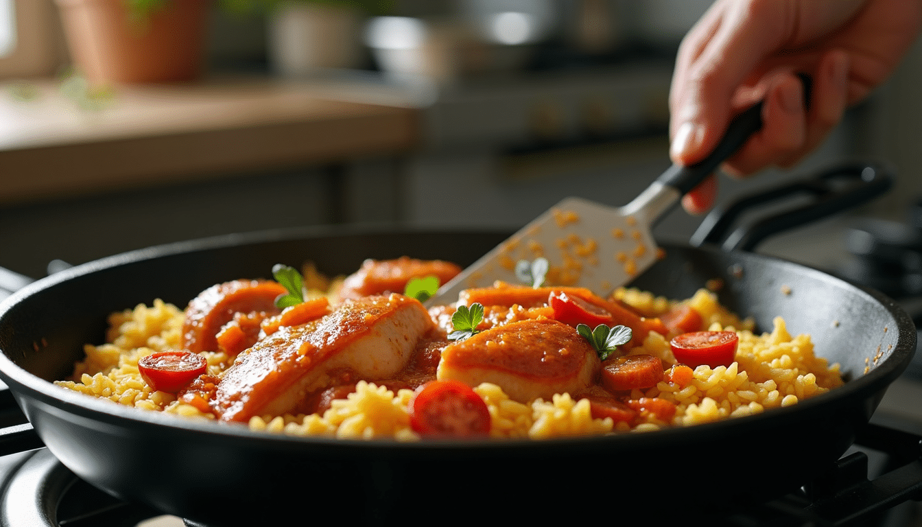 (this is how you build that crackly, golden bottom). Spoon the chicken–chorizo mixture over the top and flatten it to cover the rice. - In a separate nonstick pan, add ~2 tablespoons olive oil, the reserved sliced garlic clove, and the diced hot pepper. Season lightly and cook over medium heat
