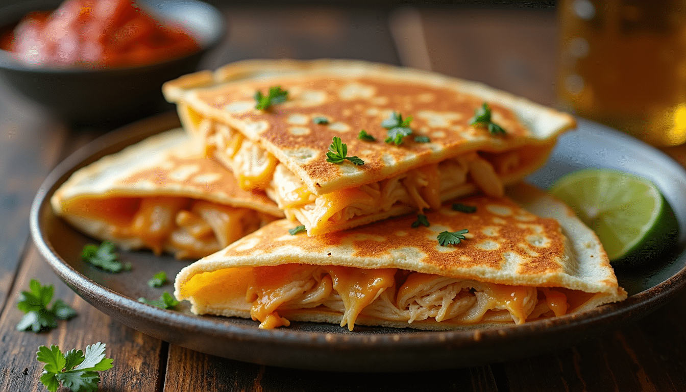 Drain on paper towels and season generously with salt. - Chicken quesadillas: Warm a tortilla in a dry skillet, flip, add a handful of cheeses, then add shredded chicken (and chopped pickles if using) to one side.