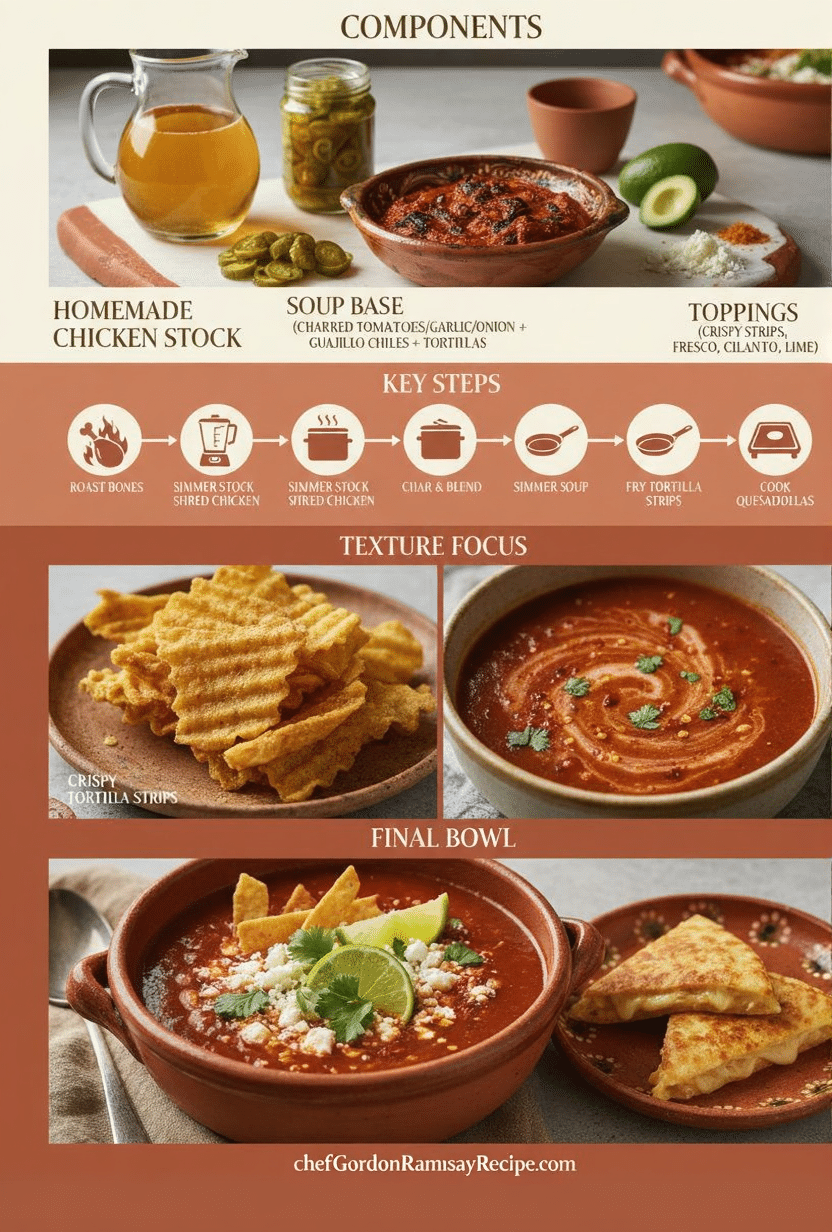 This Gordon Ramsay Tortilla Soup Recipe builds serious flavor by charring tomatoes, onion, and garlic, blending them with toasted guajillo chiles and tortilla pieces, then simmering the soup with homemade chicken stock. Finish with crunchy fried tortilla strips, queso fresco, cilantro, lime, and serve with cheesy chicken quesadillas and tangy jalapeños en escabeche for heat and bite.